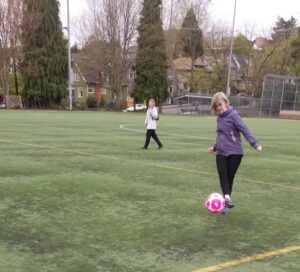 Lynne’s suggestions improved our outdoor exercise today. Last Saturday she considered the children’s plastic orange beach ball too light and too small for kicking on