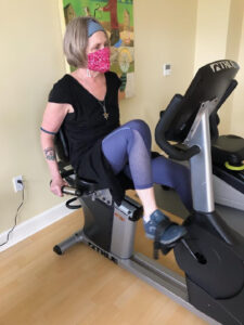 This morning Lynne exercised with her new mask from Patricia the cat guardian angel while the cat hid behind the sofa. He’s had a rough
