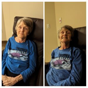 Lynne resting in bed. Excited to see me. Ask to kiss her on her forehead. Once I asked to kiss her on the forehead, then