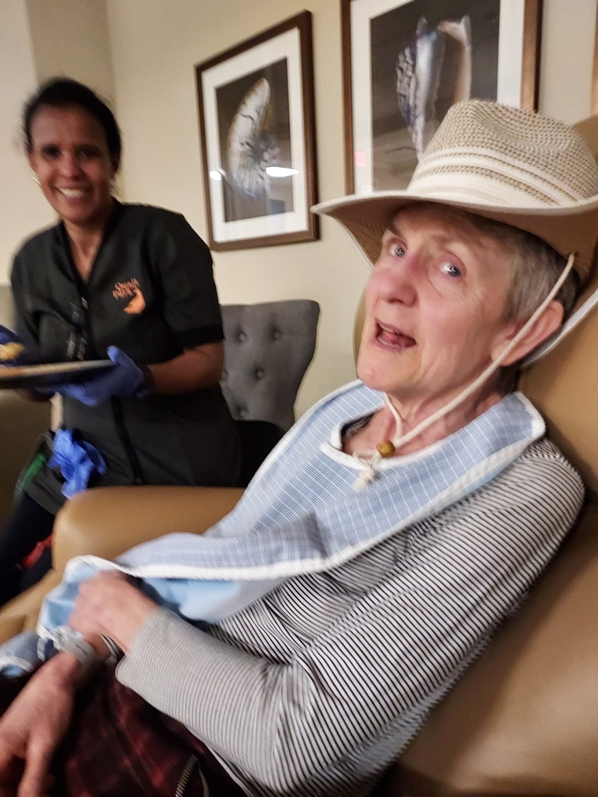 I know Lynne feels my presence. She sips water, eats treats. Her eyes rest on mine. She talks Lynnese & English to me. She laughs at me with blue eyes. She wants my hat. She is sad when I leave. Every visitor senses it. Tags: Alzheimer’s caregiver dementia father-daughter
