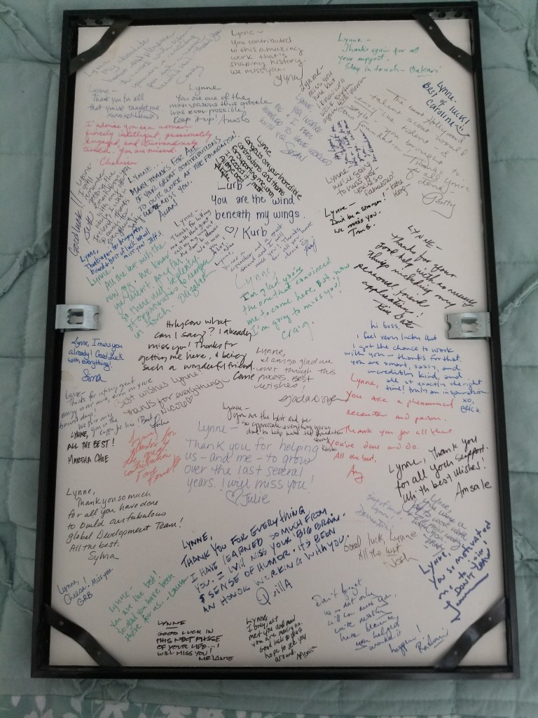 I interviewed Candy, a friend of Lynne’s about their time together at the Bill and Melinda Gates Foundation in 1996. I am grateful for her memories full of Lynne’s fun and professional skills. I sent her an image of an article about recruiting talent for the Bill and Melinda Gates Foundation published in the Seattle Times on October 17, 1996 Titled, “Want to Work for Gates?” The front page was in a 11 x 17 picture frame with a photograph of recent hires when the foundation was rapidly expanding from an influx of donations. The frame was given to Lynne when she retired from the foundation to work as a special education teacher. The back of the frame was filled with farewells and signatures of her fellow workers.