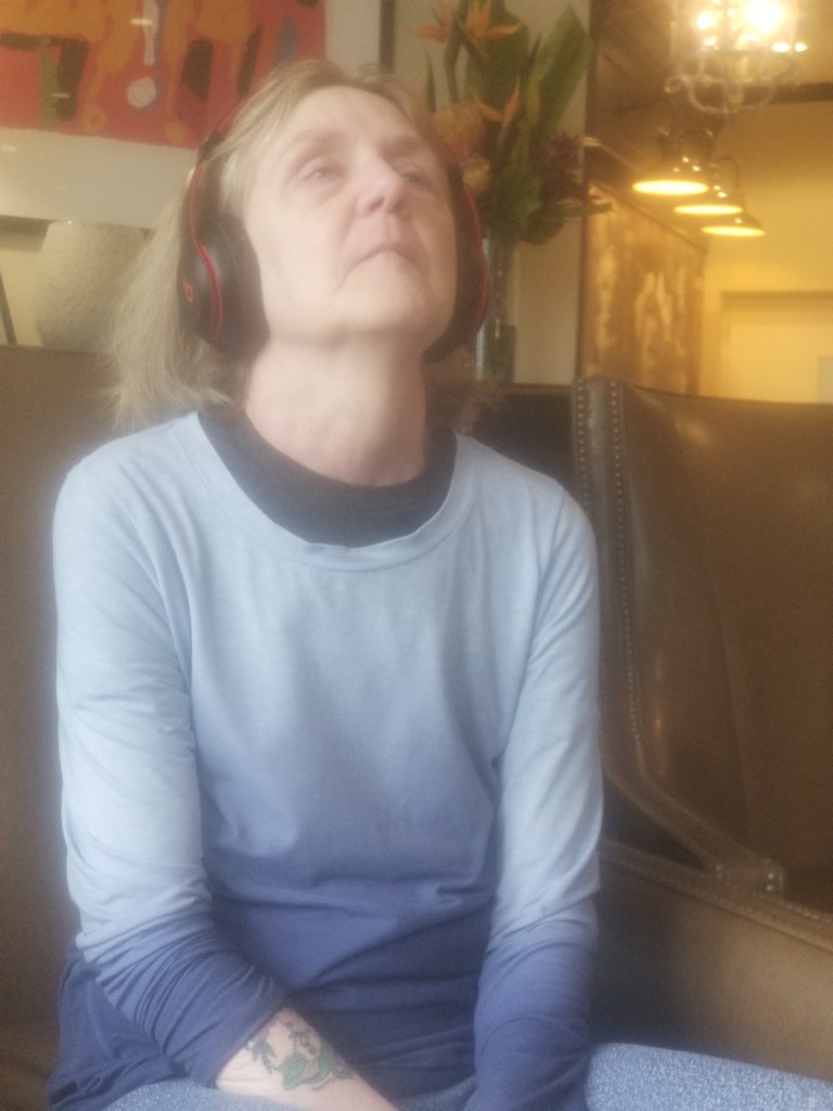 I repeated tunes in her headset four or five times if she was tracking the lyrics or the beat. She was thinking about something all the time with a running soliloquy that I did not interrupt. Oh. That’s right. Where? Wow. I remember that. Oh nice. OK. The walk more. (Whispered) I don’t want the …. There’s going to be a big riot, or a fire. Yeah. I need to go up. There. (she pointed with her finger and stood up.) Yeah, I think so.