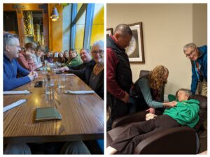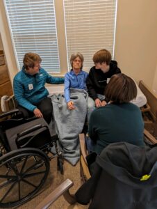 Joyous Christmas visit: Lynne’s sons & their dad, brother & his daughters, sister and I, and our partners. That day, Lynne stood, walked, sat, dozed,