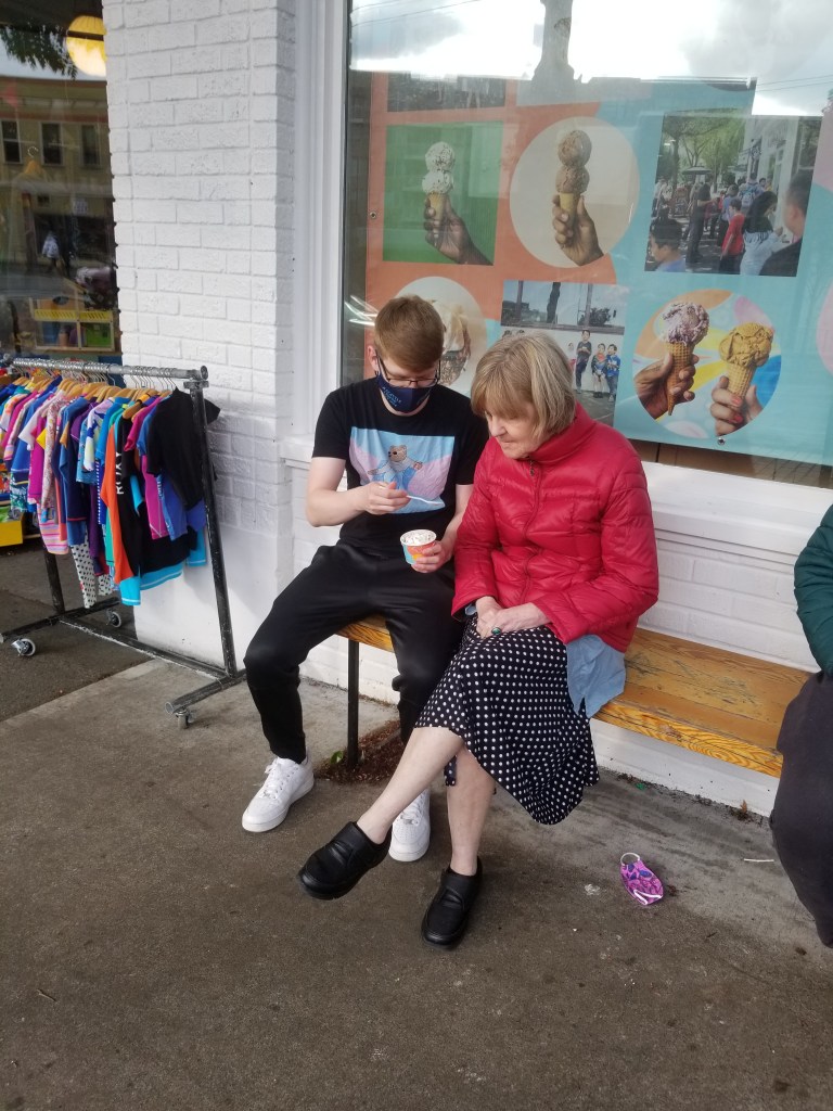 It was cold for ice cream. Her graduate zipped up Lynne’s red jacket. The posters listed ice cream, sorbets, sundaes, sherbets. The boys said she had two favorites: scout mint and salted caramel. She ordered scout mint and I ordered salted caramel to share. I warned the boys she will eat the ice cream non-stop and get brain freezes. They took turns feeding her and talking with her.