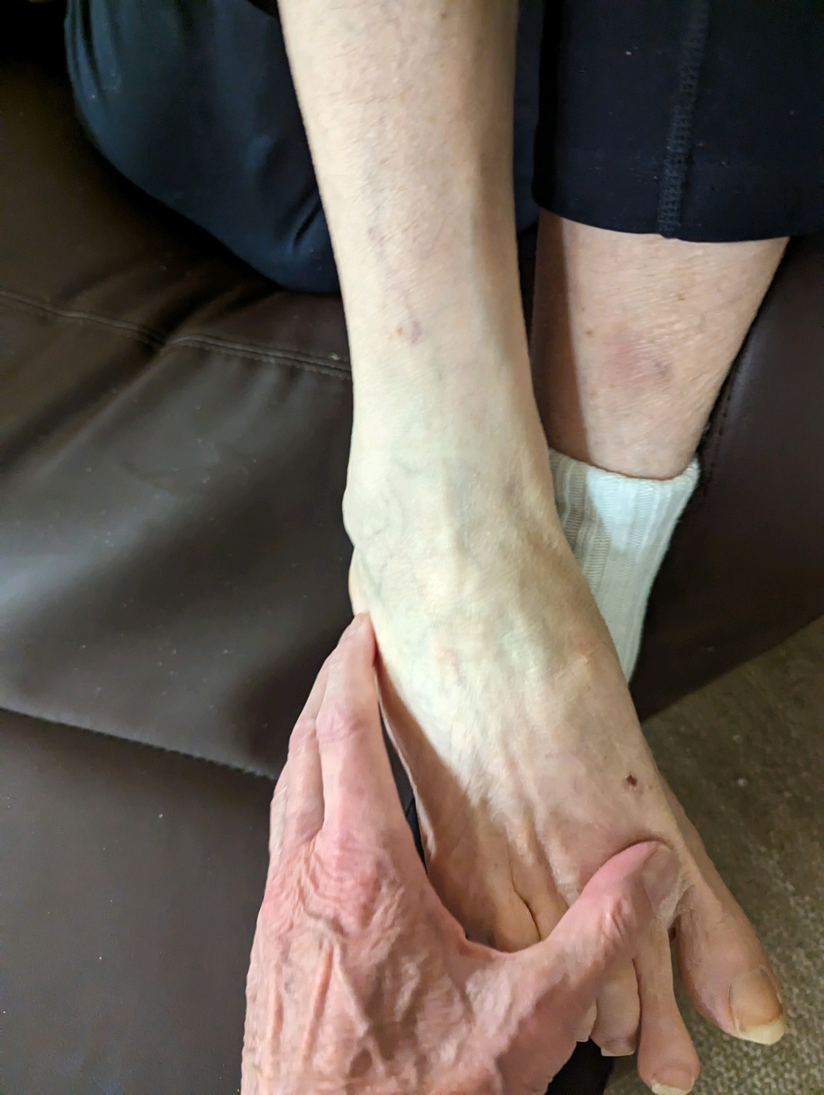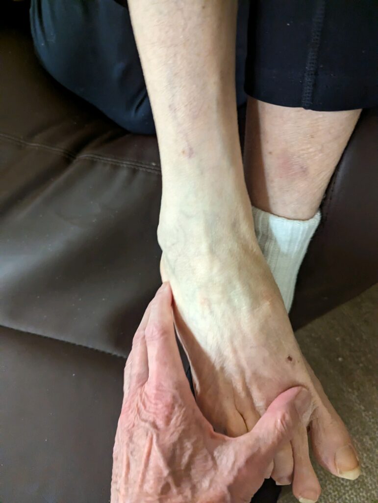 May I rub your foot? “Oh yes.” Big laugh. Her cycle begins: squeeze my hand, pulls it over her head; lets go; quiet 2 or 3 words in Lynese, big laugh .. foot feels good. Sole smooth. She let’s me keep rubbing. Peaceful