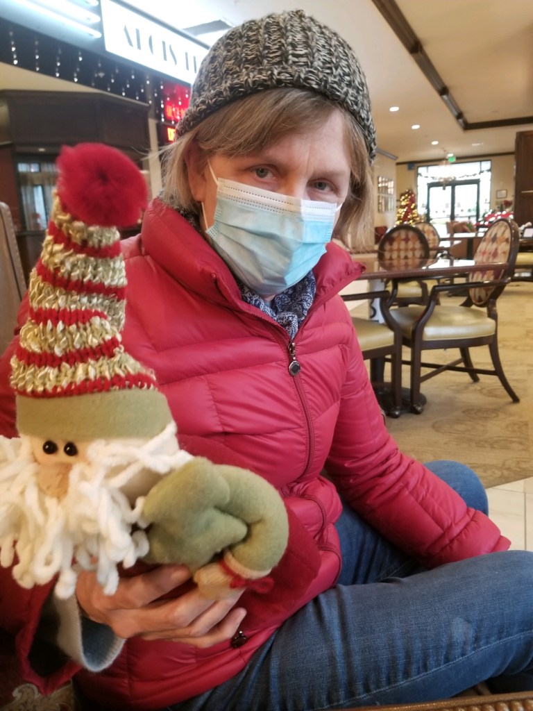 Friday we walked in a quiet neighborhood to view Christmas decorations spreading light in the gloaming. We phoned Henrik. It felt like normal family time. On Monday Lynne gave me her still strong hug for the first time since March. She also hugged a Christmas gnome from our family decorations to go alongside the 12 wooden Santas from her home. Thanks to neighbor Jennifer for that suggestion. We video chatted with Keith, Sheri and Pam.