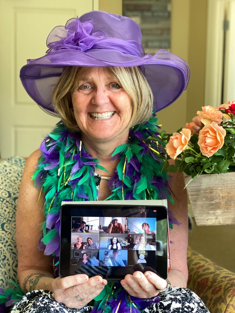 Nancy and friends are generating ideas. People could log in to Zoom and stay online for a while. If they send Nancy photos, she could post them. I could stage times for people to join in small groups. Nancy could set it up so only one person is talking to Lynne at a time. We’ve asked if Aegis could find a large screen in a “public” room where residents and staff could join, and where Nancy could add music from her computer so Lynne could dance at her party.