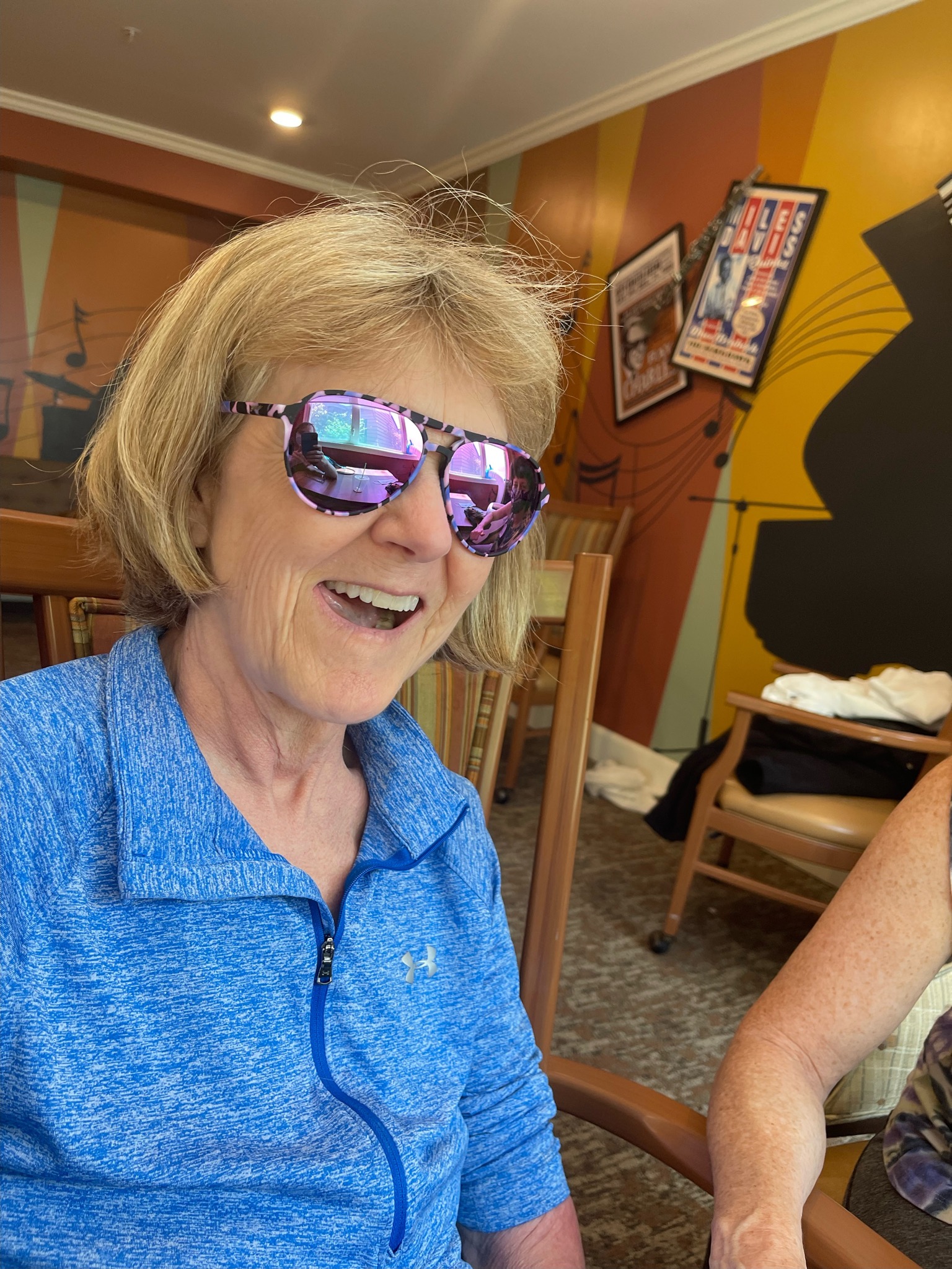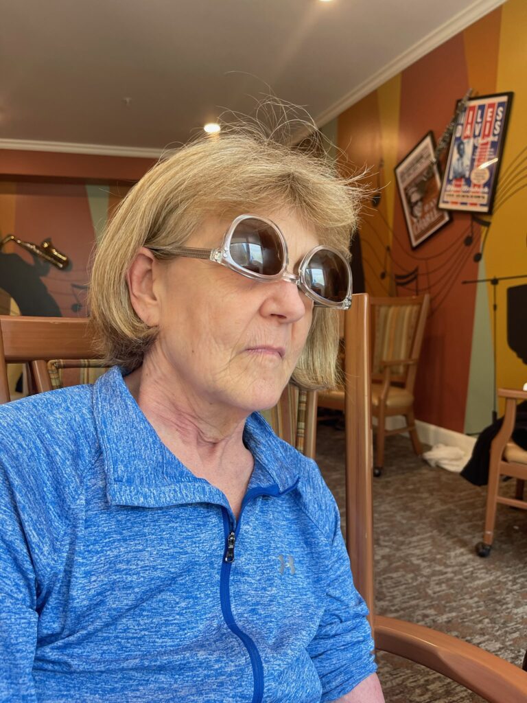 Nancy and Donna, two of Lynne’s friends had a charming visit in the dining room and sent me comments with pictures and a video. In the video Nancy brought a latte that loosened Lynne up for hugs and laughs. Then they clowned around with Donna’s sunglasses. Lynne wore them upside down for 15 minutes and seemed quite proud of herself.
