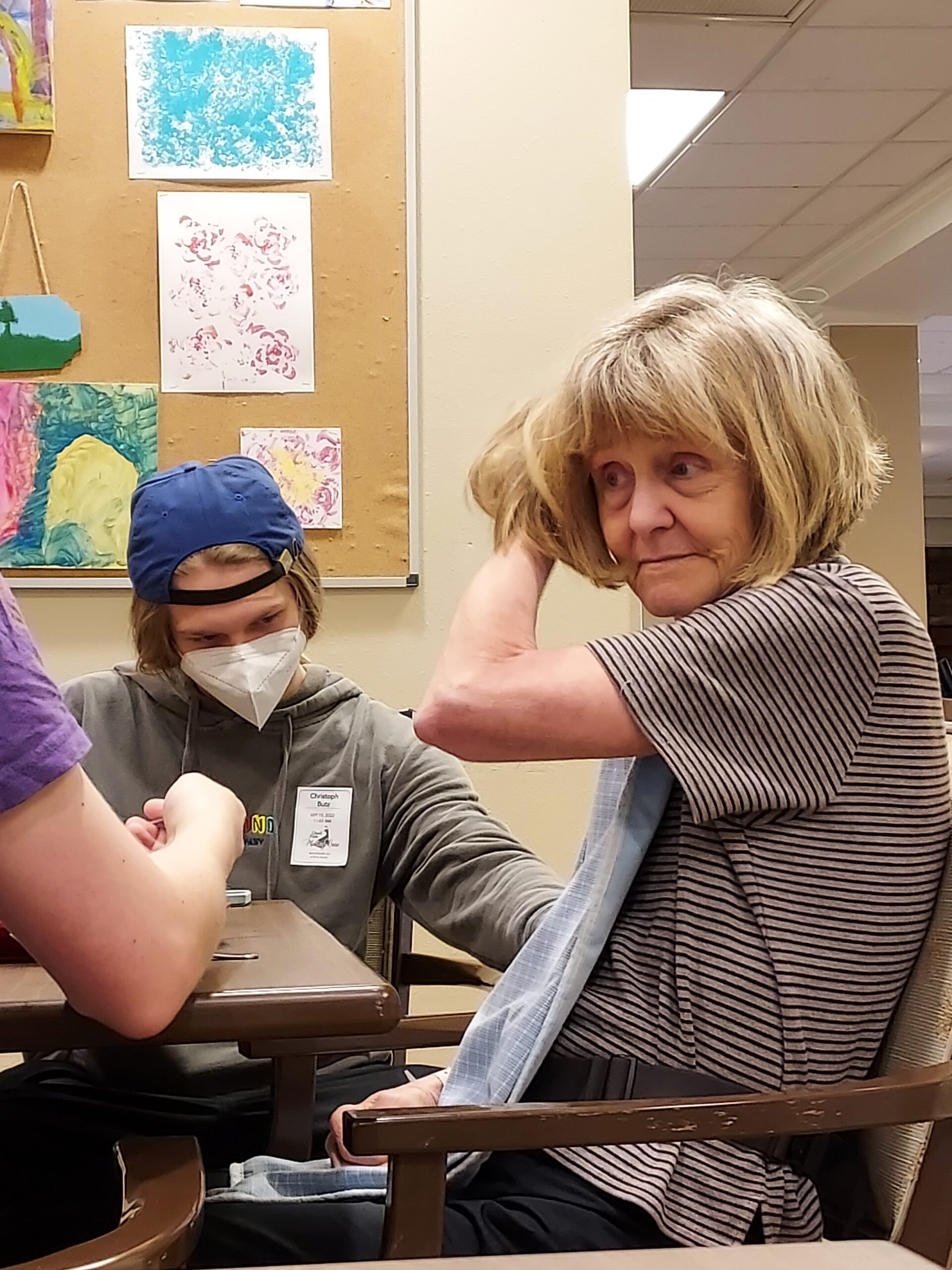 We had two pleasant visits with Lynne in her new memory care floor without the anxiety she had felt earlier in the week. Thursday she was joyous as she recognized and hugged each son. Simon and Christoph spoon fed her lunch. At one point she saw me at a separate table and smiled, “Oh, my Dad is here too.” On the way down in the elevator, Christoph said, “That’s the best I’ve seen her in quite a while. Friday I joined her to watch a game show on TV. I said, “By the way, I have some brownies for you. She surged forward with a nod of her and said, “Get to it, huh!” We laughed. We walked to the aquarium room with deep armchairs where we sat quietly. I watched her face go through one emotion after another: a light smile, a frown, an emphatic gesture to finish an unrecognizable statement, concentration as she scanned the area, and softening her muscles when she laid eyes on me. I remember loving to watch her emotions surfacing and vanishing across her face as an infant. She looked alert, loved, and relaxed. I wondered if she enjoyed the companionship as much as I did. I stood up. “I gotta go,” and kissed her on her head. She tipped her head. “OK.”