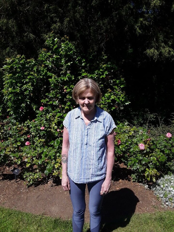 She worries a lot. She walks her floor from the door to the garden courtyard past the elevators to the edge of the dining room. She says, I have to stop here. She does not like to sit with the people in the dining area on her floor who spend most of the day listening to music, an activities program, or the big screen TV. She turns around to start another loop. She likes the help from caregivers in the entire building. She likes bus rides to gardens. She was the only resident who walked in the Woodland Park Zoo Rose Garden.