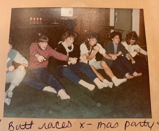 Mary had photos of high school days at Christmas Parties and butt racing. Butt racing was one fun I missed during high school, so Mary showed me the picture of girlfriends sitting on the floor of a basement scooting on their butts to the opposite wall. That flashed memories for me because Lynne preferred scooting across the floor on her butt in her diaper by pushing off with one hand and then the other. She scooted so fast she refused to crawl. We set her down on her knees because we read crawling was important for developing body skills. She’d push onto her butt and take off. She crawled briefly walking was easier by then.