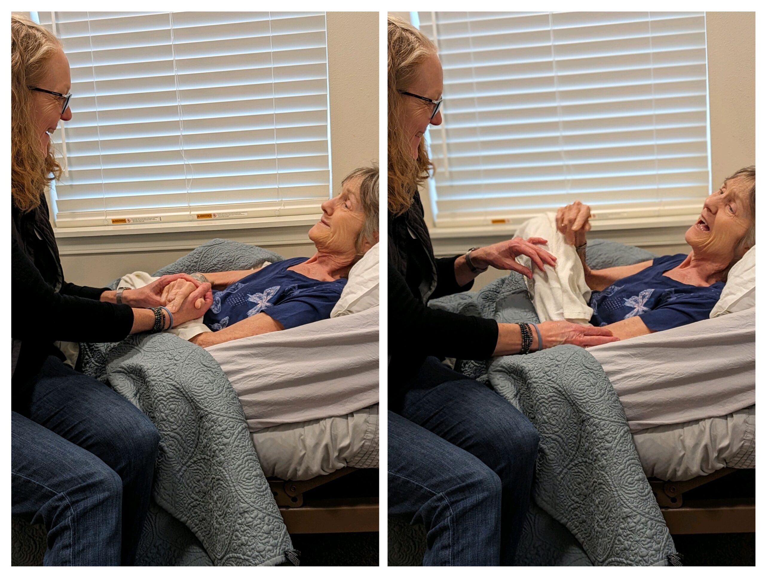 Lynne mostly slept. Chatted with friend KarenC & sister Pam. Brief agitation. Drank Ensure for breakfast. Carol’s oximeter measures oxygen. If too low they’ll put her on oxygen. Carol: “She’s so calm it’s unbelievable Tags: Alzheimer’s Dementia Caregiver Caregiving father-daughter