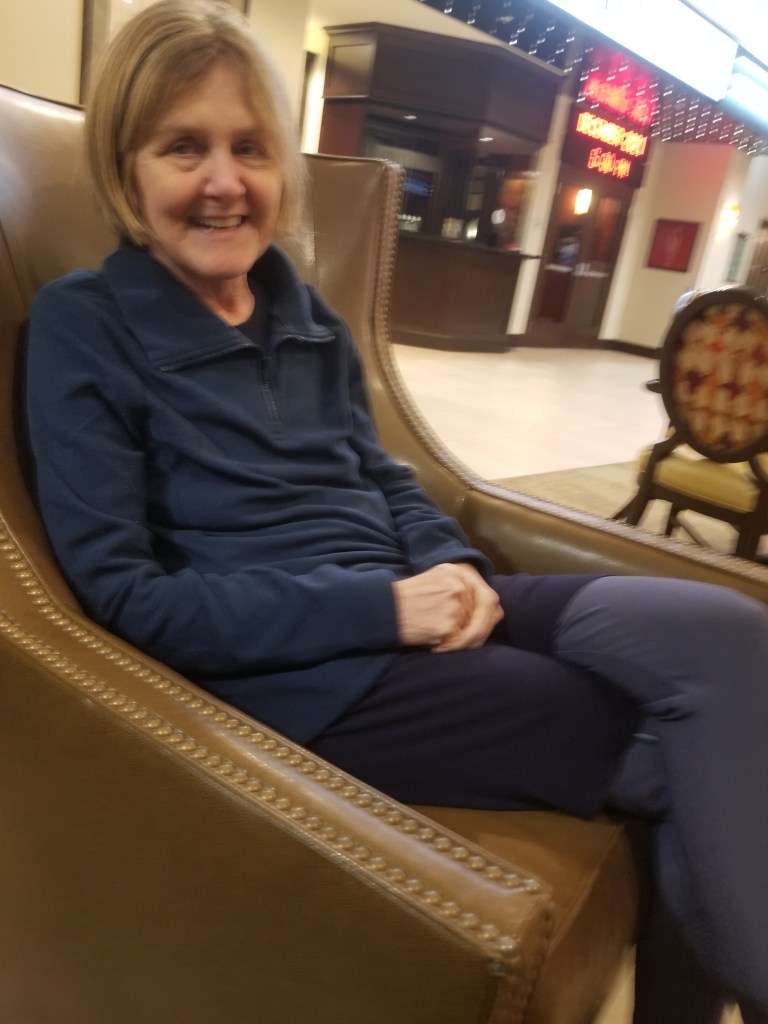 We walked to her apartment to watch TV, but after we watched repeated ads of Medicare Plan C, she said, “I can’t stand this,” and left the room. We laughed when we danced a little bit. We walked the halls as she went through multiple moods with tears, pushing me away, shouting at me, then smiling, focused, following me in and out of her apartment. She says, “I hate this place.” I tell her “Lynne you are safe here. Everyone loves you.”
