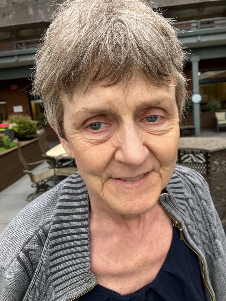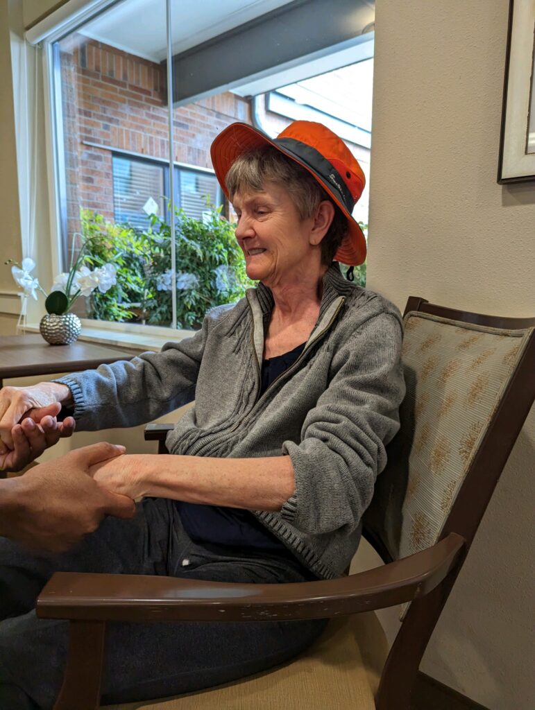 11:03 am Hospice: We walked inside & outside, listened to music. Lynne didn’t lean on her knees; not distressed; a little spacey & calm.