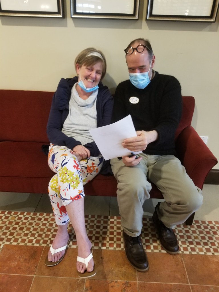 Lynne joined me for our visit in a private room. She wore black and gray cotton sweaters, summer red and yellow capri pants and flip flops on bare feet. We had 11 inches of snow outside her window. She said, “There was so much snow. … You couldn’t go.”